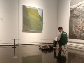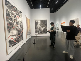 随着师生在郑州美术馆新馆前集结完毕,周宾老师以《轩辕问道图》为例,解析人物动态与叙事逻辑:“黄帝抬手的45度倾斜,既显威严又暗示故事转折,这是用造型语言讲好中国故事的核心。”张建森老师借助油画《大河新韵》,用几何图形拆解构图法则:“左上三角形山峦与右下弧形河流形成对角线平衡,速写创作可借鉴这种‘稳中求变’思路。”王聿恺老师则用生活化比喻讲解笔墨变化:“笔尖含水量像奶茶甜度——七分糖墨色温润,全糖焦墨苍劲。”指导学生现场尝试“奶茶墨法”创作。