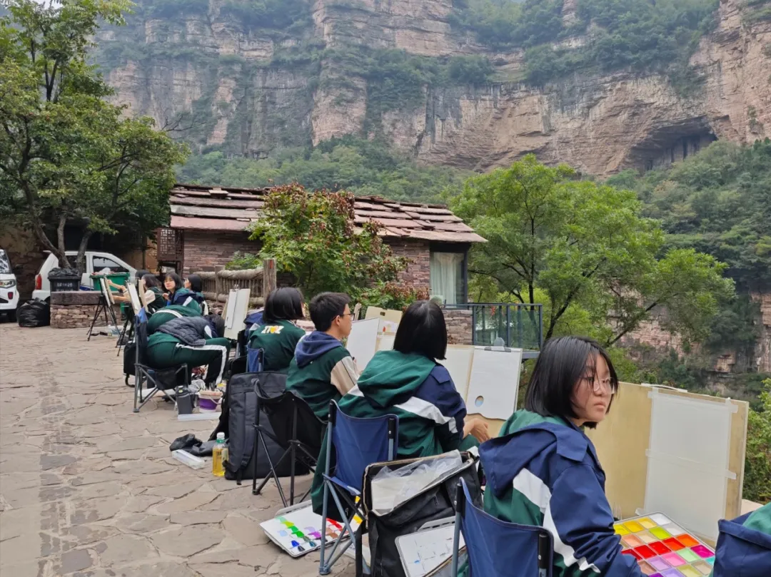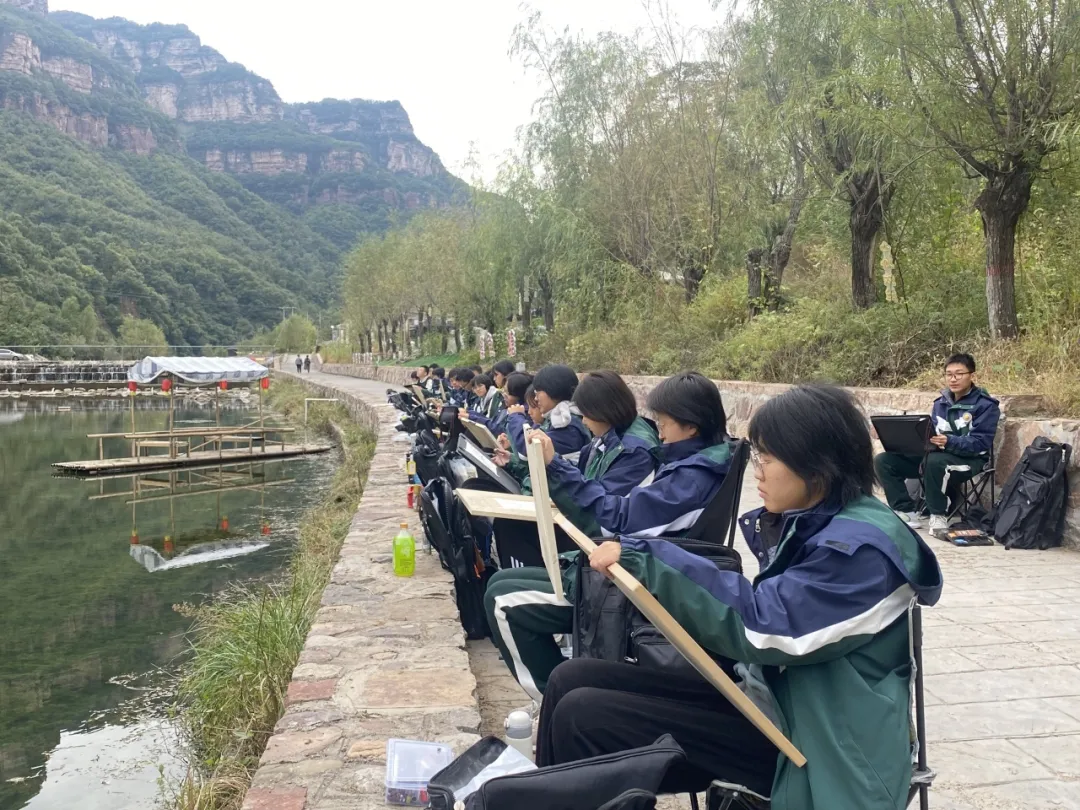 下午,一列列学生身着“铁六绿”,肩扛画具,跟着班旗,朝着各班既定位置出发。一抹抹“铁六绿”,有规矩讲纪律,不时吸引路人驻足和赞叹,成为太行苍翠图景中最灵动的点染。这里山峰巍峨、溪流清澈、建筑古朴、树木葱茏,同学们或静坐于山石之上,或穿梭于山间小溪,或排列于路边小道,迫不及待地拿起画笔,用心感受大自然的韵律,用画笔捕捉光影的变化,用色彩表现山水的韵味,每一笔,每一划,都饱含着对石板岩独特韵味的深刻理解与热爱。班主任们暖心陪伴,美术老师们则在一旁悉心指导、亲自示范,引导学生更好地将自然之美与艺术创作相结合。