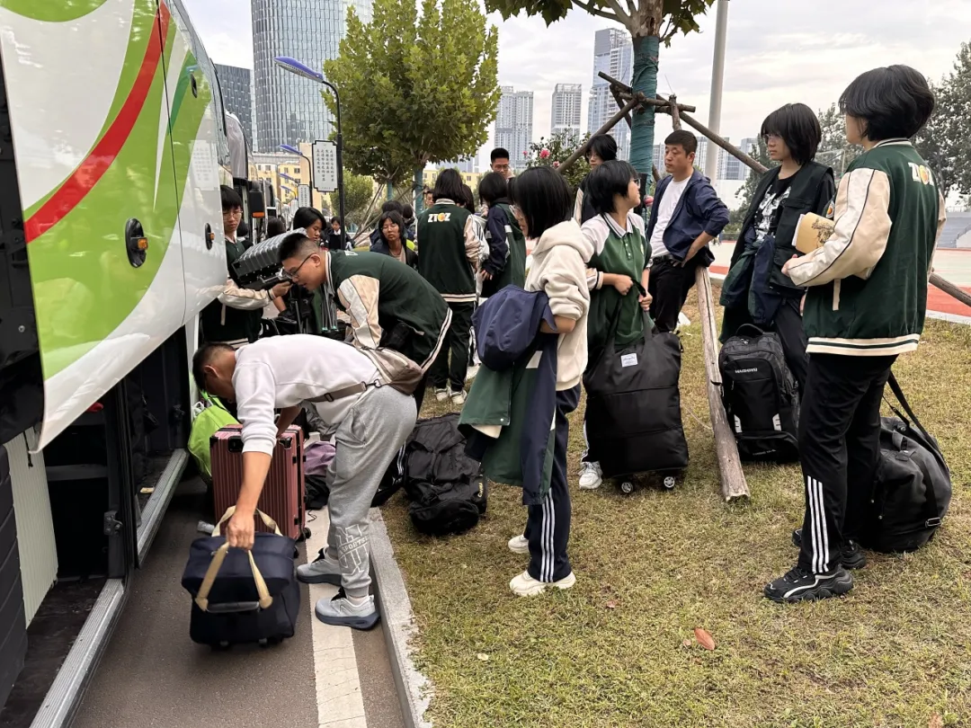 出发前,学生们心怀期待之情,抚星追月,在熹微的晨光之中,整理行囊,整装待发。班主任老师在自己负责的车前清点人数,帮助学生搬运行李,并悉心交代路途上需要注意的事项。大地还未彻底苏醒,少年们已经迎着清爽的秋风,朝着探寻艺术的彼岸驶去,这是一次艺术探索之旅,更是一次自我成长之旅。