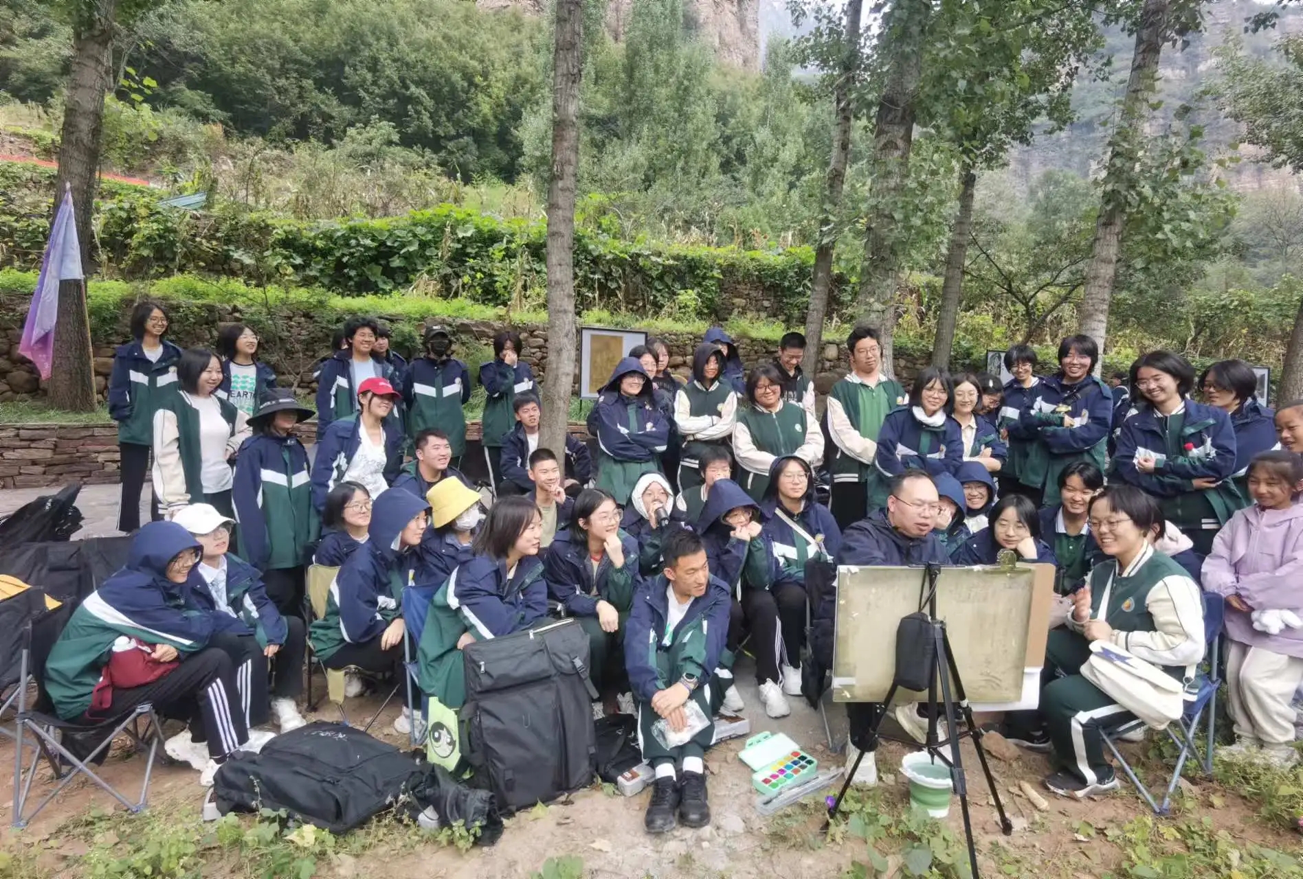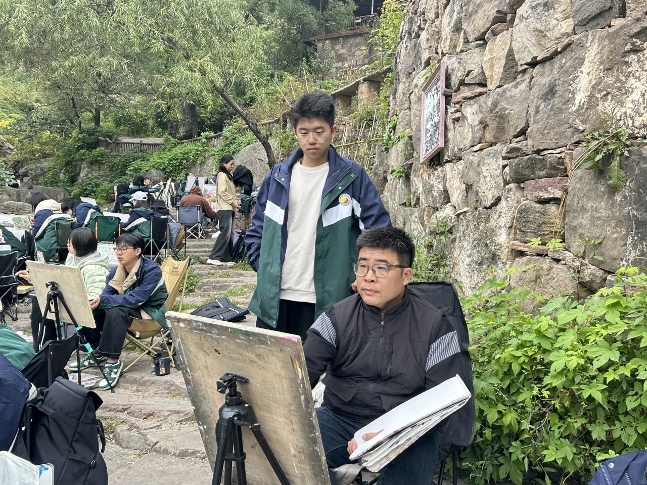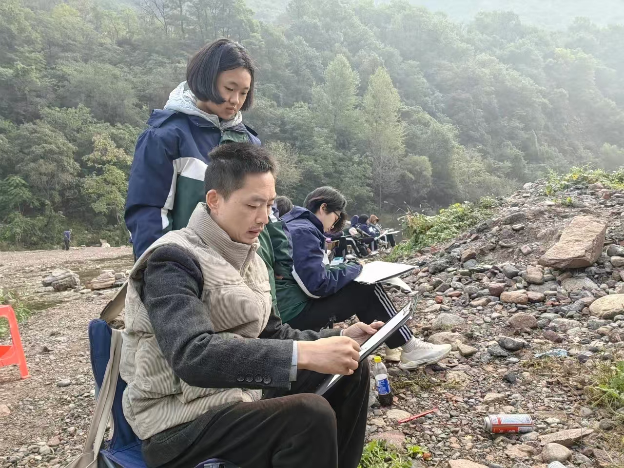 用过餐饭之后,学生在班主任和美术老师的带领下,高举班旗,精神抖擞兴致高昂地走向各班的写生阵地。最忙碌的当属美术老师,他们安排学生坐定之后,分配小组之间的各自任务,帮助学生选取景物,溪水旁,高树下,悬崖边皆可见他们的身影。他们指导学生在纷繁复杂的意象中删繁就简,以小见大,用简单线条勾勒小景之大韵;或是在光影的阴暗晦明之间,点小面而染大景,用斑斓的色彩晕染山中景色之卓美。学生有疑惑难解之处,美术老师则逐一悉心指导,师生运用互相交流学习的自由笔触,呼唤峡谷中最和谐的谱曲。