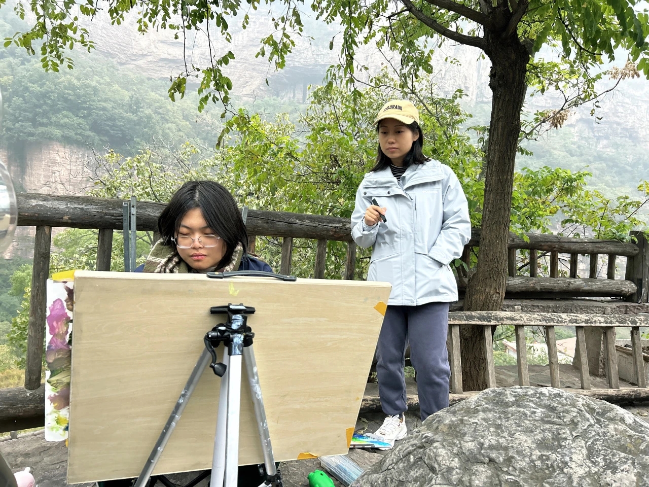 峡谷中天气阴晴难定,一时之间波动云颤,但美术老师坚守在自己的阵地上,无惧天气反复。阳光明媚时,他们将学生聚拢在自己身旁,针对共有的问题一一指导。学生们在相互探讨和老师的讲解中获益良多,然后投入到笔尖,绘画在纸上。如若天气阴雨连绵,美术老师也利用好每一分秒的时间,反馈学生的画作,或是谆谆教诲如春之虫鸣时时在耳,或是声声勉励如夏之凉风舒缓心神。付出的是老师,收获的是学生……
