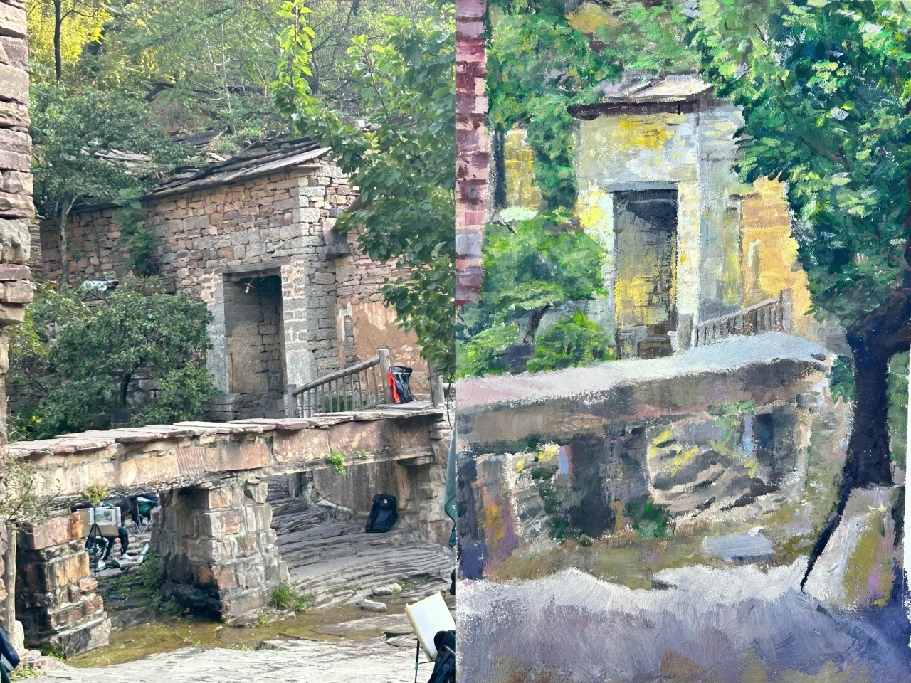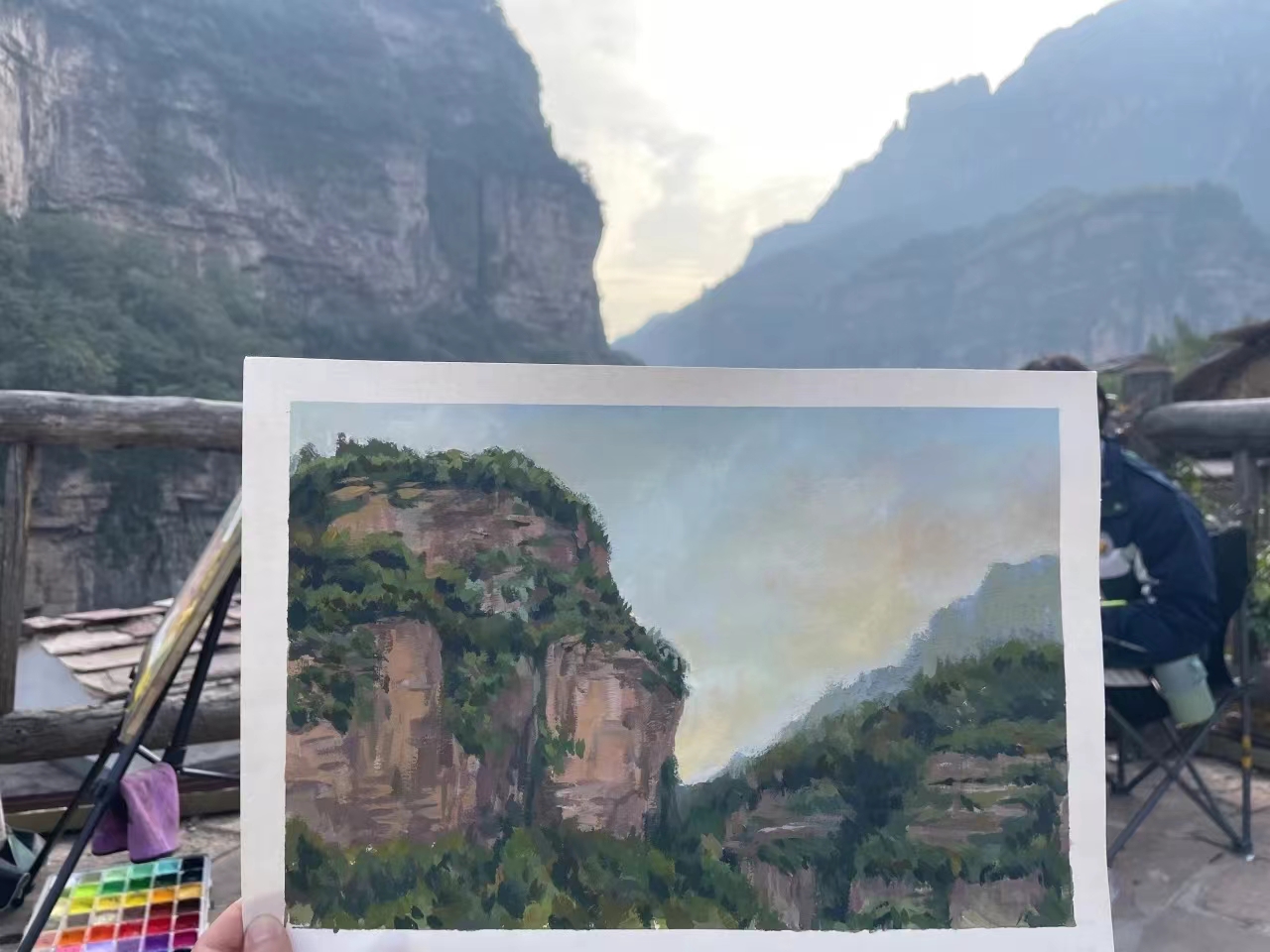 壁立千仞,崖生万丛,钟灵毓秀,地灵人杰。太行山把最美的一段景色留在了十月的石板岩,石板岩将自己最多彩的风韵留给了铁六学子。学生们站在自然美景之中,感慨大自然沧海桑田的写意之笔,给予了超越人们期待的人间幻境。学子们或驻足村后观察石瓦修砌的小庙,感慨传统与自然的亲切粘合;或立于民居落地玻璃的山墙之外,感悟古朴与现代建筑艺术的无声碰撞;或聚集于昂扬生长的孱弱花蕊之畔,默默品读弱小与坚强之间生命的绽放;或是倚坐太行石阶而尽览岩板流水与万丈崖壁共绘的秋日韵章。学生执笔,勾胸中丘壑,染万物华彩……