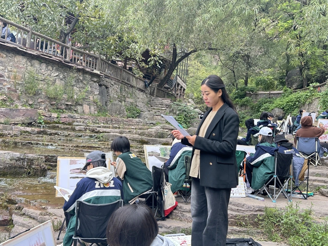 白天,当学生们外出写生时,班主任们或在前引领,或护航在侧,或在班级队列后面收尾。“注意脚下安全”、“小心过往车辆”、“后面的同学不要掉队”,这些温馨的话语,如同爱的旋律,时时传递着无尽的温暖与力量。在学生们认真作画时,班主任们或仔细阅读批改学生的每日写生心得,用智慧全面了解每位学生的成长与动态;或趁美术老师停下来的间隙,与美术老师交流,共同探讨学生的创作情况。山里天气变幻莫测,他们更是时刻关注学生健康状况,及时提醒学生增添衣物、防寒保暖。当学生身体不适时,班主任们也总是第一时间出现,如同守护天使,帮忙联系取药、悉心叮嘱。他们细腻入微的关怀与呵护,让学生们随时能感受到家的温暖。