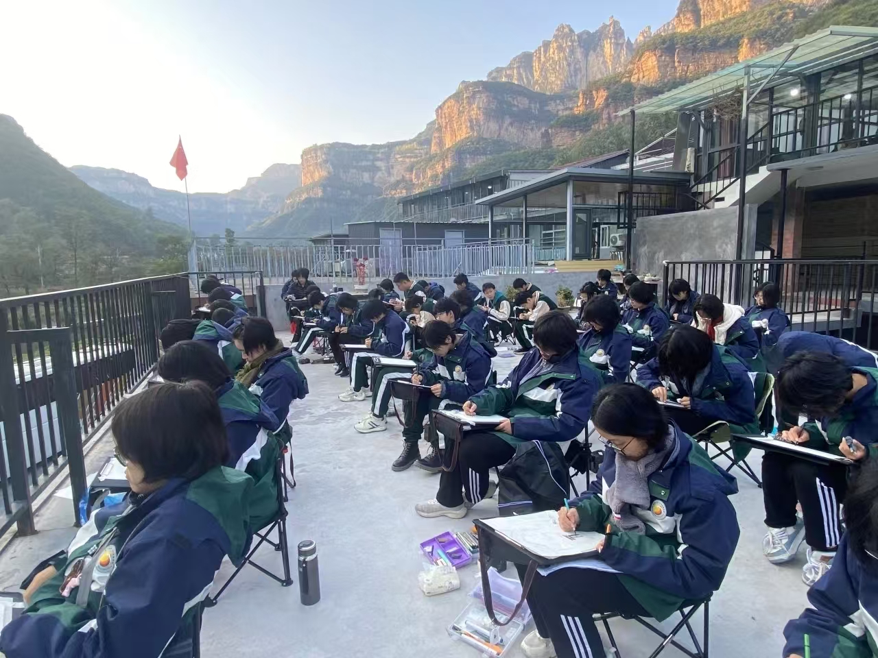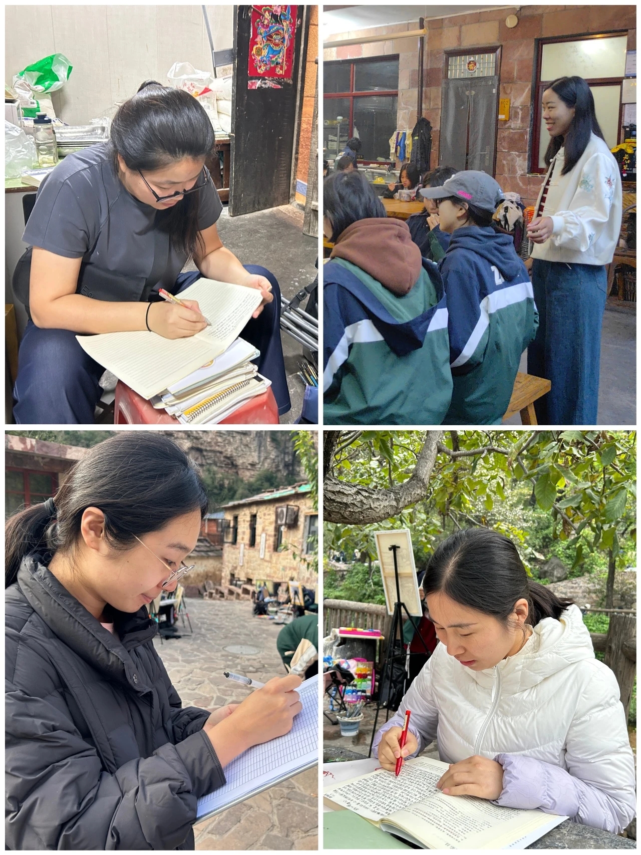 十月的石板岩,色彩斑斓,雄岩流丹,奇峰叠翠,石径蜿蜒,为学子们提供了无尽的创作灵感。在写生期间,同学们深入自然,用心感受大自然的鬼斧神工。他们或眺望远山,凝视云海翻腾,在画纸上再现“会当凌绝顶”的雄伟壮观;或静坐于山间小径,聆听溪水潺潺,细细雕刻“小桥流水人家”的古韵静谧;或观察着古朴村落,触摸石阶、石墙,描摹出“采石筑屋,依山而居”的千年韵味。在这太行山的怀抱中,学生们沉浸于自然的韵律与气势之中,每一笔,每一划,都是对自然之美的深情描绘,都是对生命之韵的深刻感悟;每一笔、每一划,都记录着他们与这片土地及其历史的深刻情感交流,也见证着他们艺术之旅的每一次心灵触动。