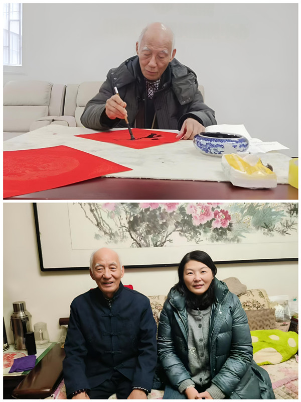 来到八十多岁的退休教师张文民老师家里时,他正在为社区写春联,看到学校来慰问,张老师非常高兴,立即作诗一首: