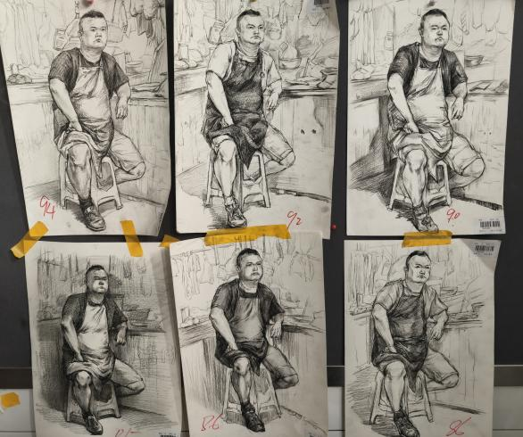 各班展墙的画均是美术老师精心布置的,有时把层次差不多的放一起,这样方便一起点评;有时把层次差的比较多的放一起,这样方便那些程度弱的同学进行学习。有的老师训练色彩,有的老师训练速写,有的老师训练尺幅大的,有的老师训练常规尺幅。高二的美术因材施教,都有自己的计划,他们的出发点都是为了学生的进步。