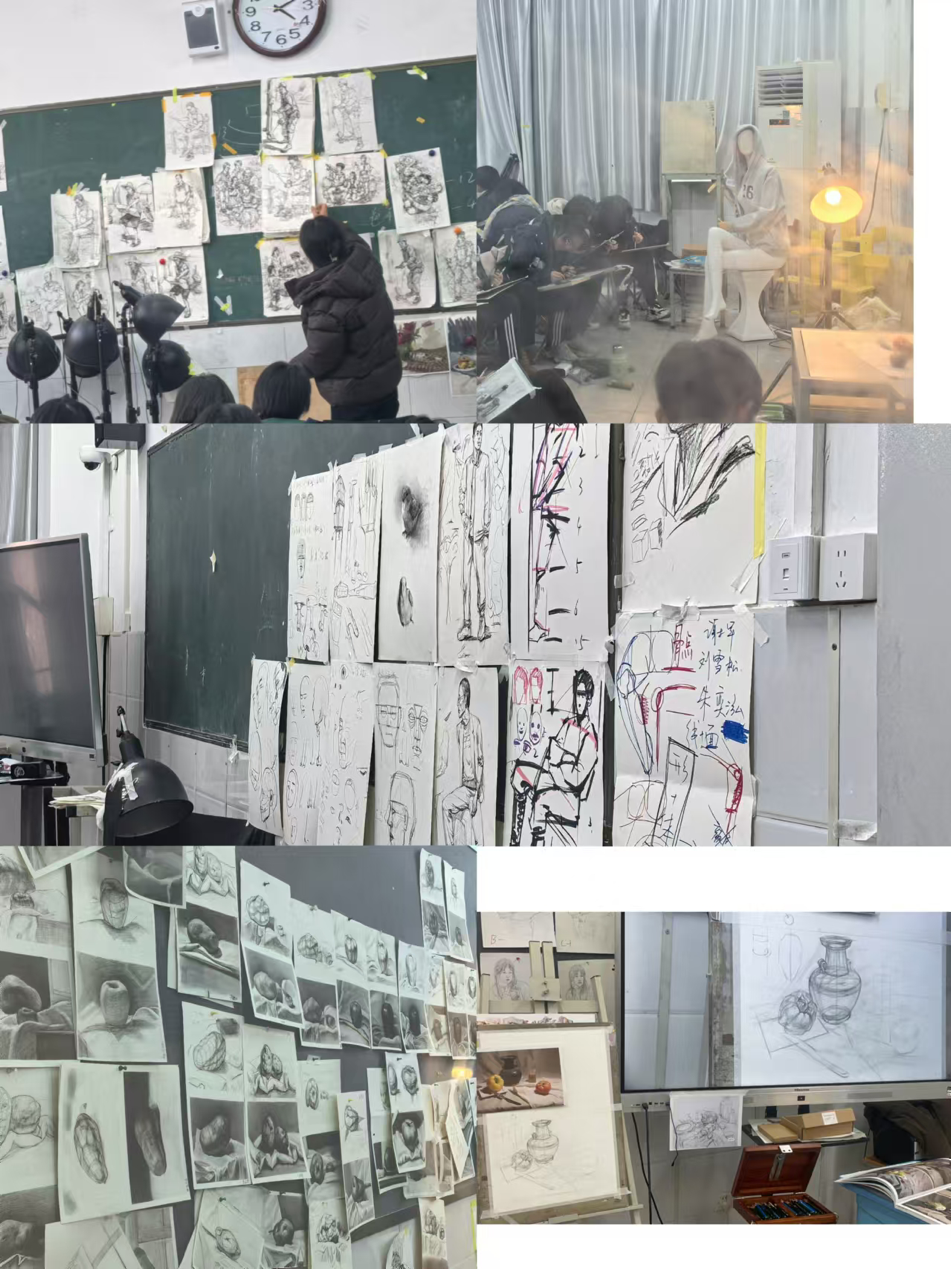 在上周的美术鉴赏课中,通过对大师作品的奖赏学习,姚佳老师鼓励学生们将作业整理得井井有条,并将其张贴于墙上,以便于老师进行检查,同时也便于同学们之间相互学习。这样的做法旨在激发学生们对作业的重视为了让学生更深入地理解人物,郭帅宗老师利用模特模型,帮助本班学生更透彻地掌握人物结构以及人物动态下的衣纹规律。李丽娜老师引导学生将单个静物的结构与光影效果融合,深入研究物体的体积和造型规律。褚楚老师的课堂讲解笔记,详细的将课程知识分门别类的做出了想对应的课件笔记演示,让学生了解的更为全面。周宾老师的课堂进行了一步一步的带画,针对班上基础弱和学生学习能力弱的情况进行了细致的辅导。