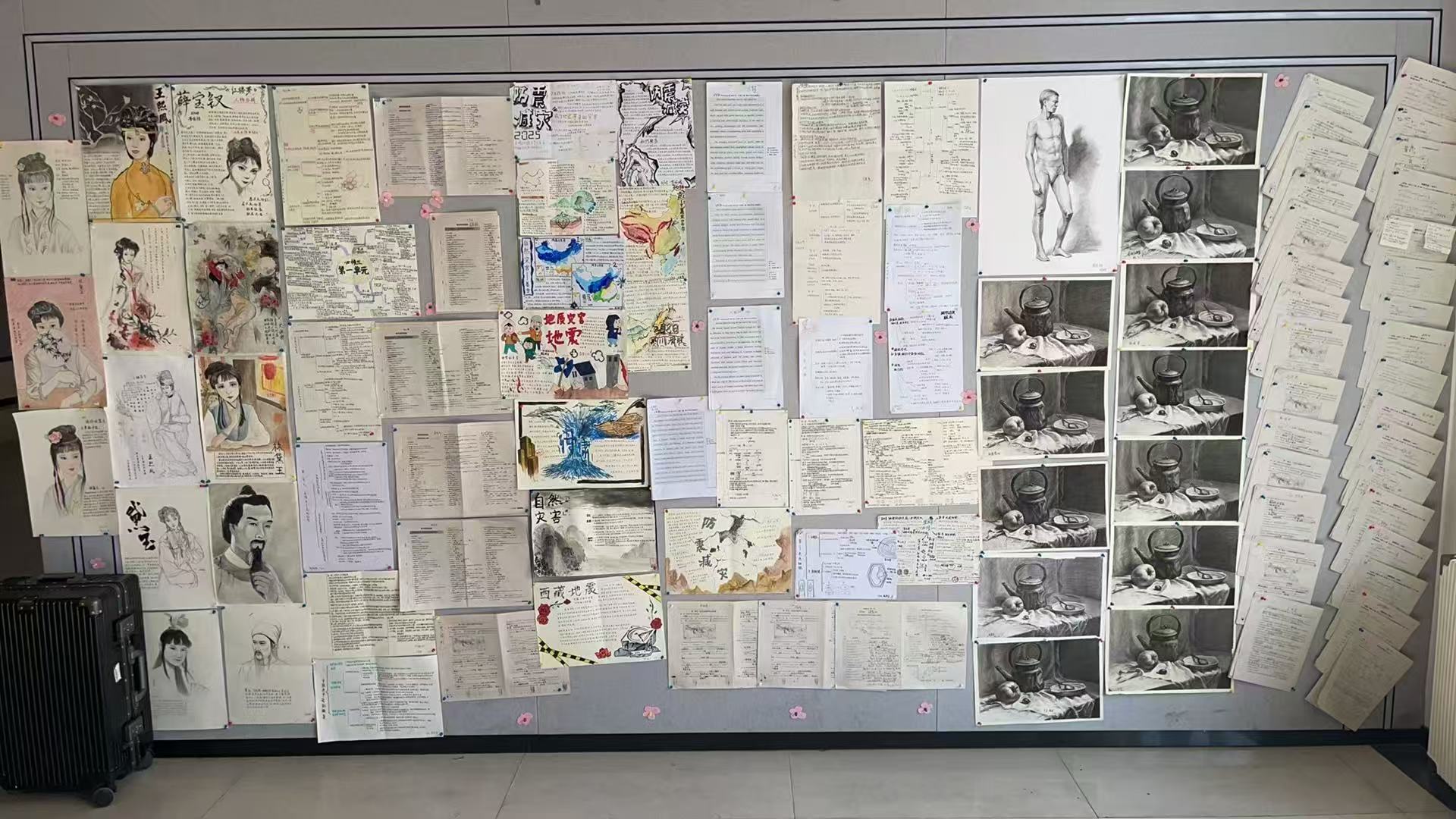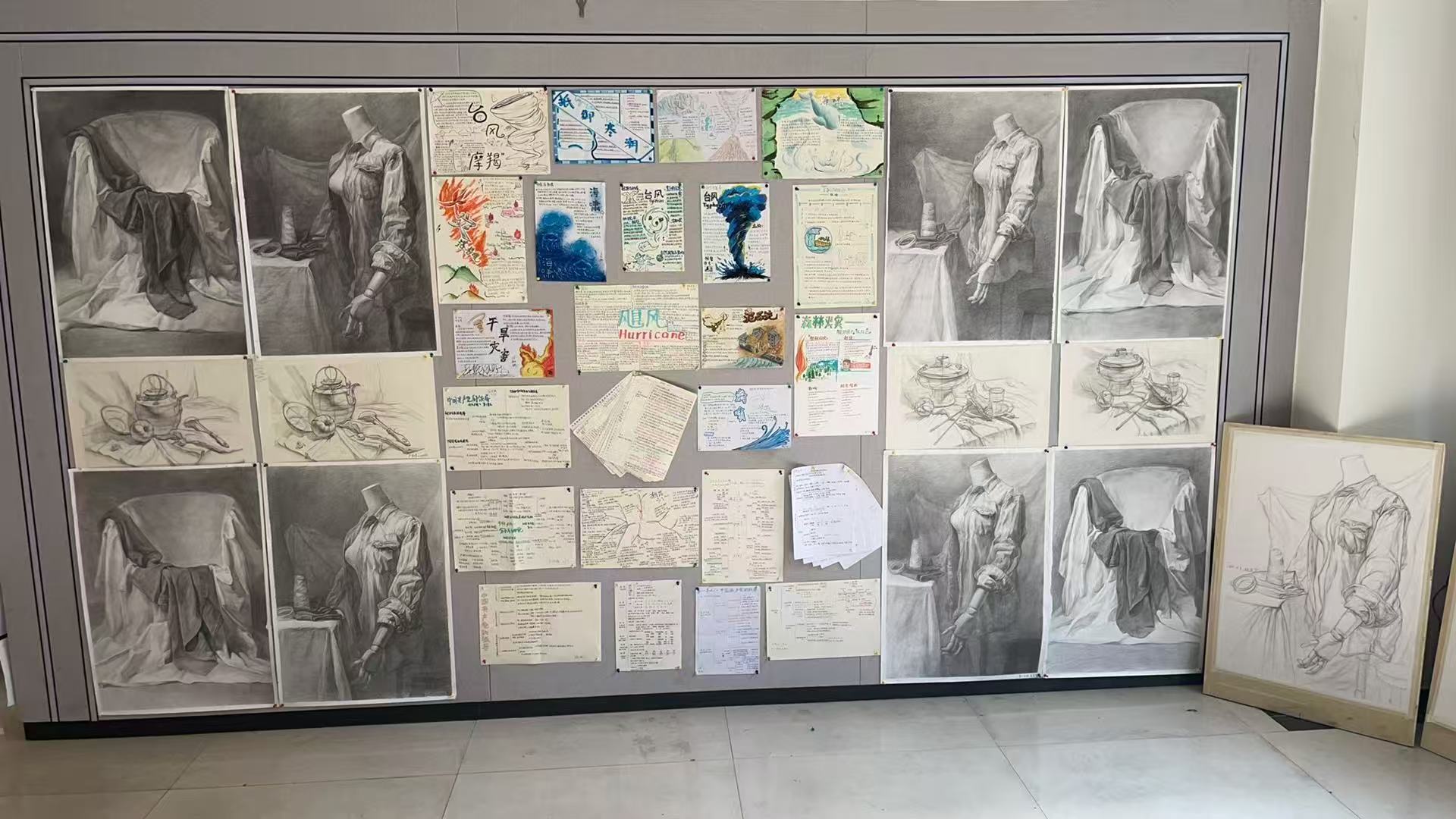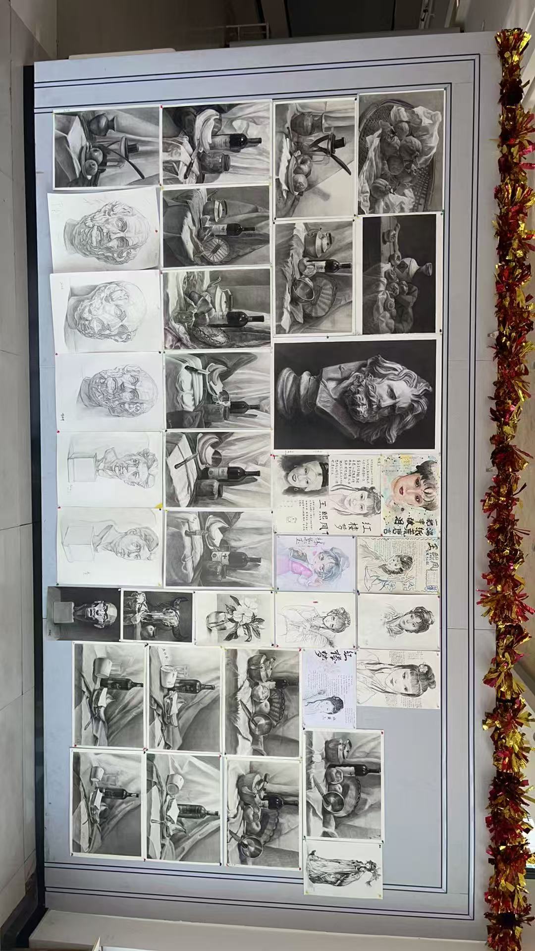 其中高一一班学生展示的作品展示了对绘画造型基本功的高度要求,高一三班展示的精微素描展示了学生对物象的细微观察能力,高一五班学生作业展示的是学生对物象感受的快速捕捉能力,高一八班学生展示了不同层次学生的突破,高一九班展示了光影造型和线性造型不一样的表现手法,高一十二班不仅展示了素描作业,还让学生尝试了色彩风景,激发学生对艺术无线的憧憬。