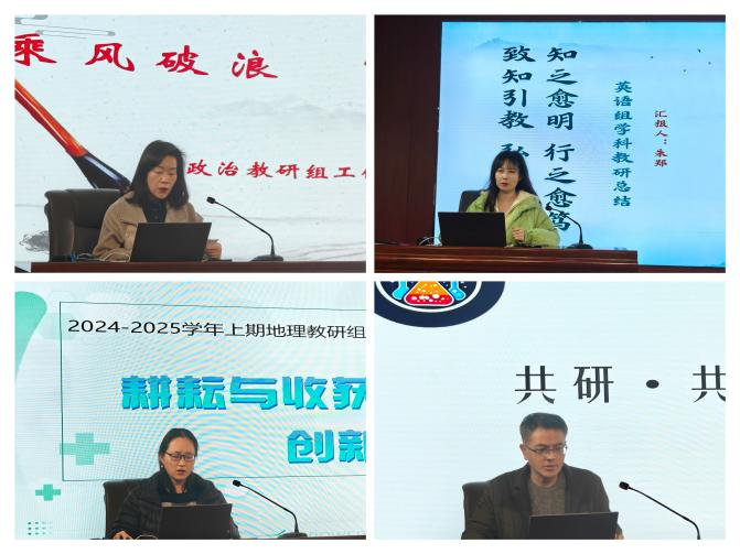 随后,各学科教研组长以PPT的形式,基于示范引领,凝聚合力,发展创新等主题分别对上学期教研工作进行了总结,并对新学期教研工作进行了规划和安排。各教研组立足学科特点,从“教学常规落实、教研活动开展、青年教师培养、教学质量提升、课题研究精进”等方面进行了深入交流,总结了经验,分析了不足,并提出了切实可行的改进措施。
