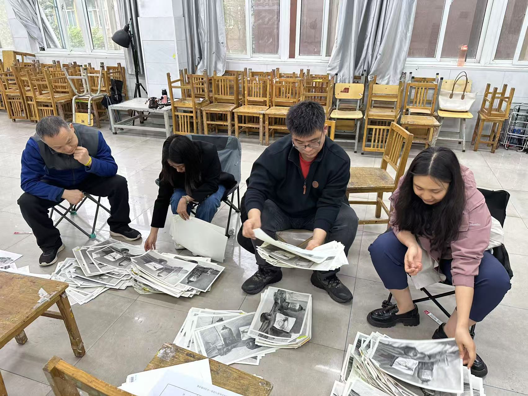 以素描试卷批改环节为例,老师们首先将试卷进行初步分类,划分出大致的档次。随后,针对每个档次的试卷再进行细致筛选,从构图合理性、造型准确性、明暗关系处理、细节刻画等多个维度综合考量,确定最终得分。在速写和色彩试卷的批改中,老师们也同样依据相应的评分标准,严格把关,确保分数真实反映学生的能力。