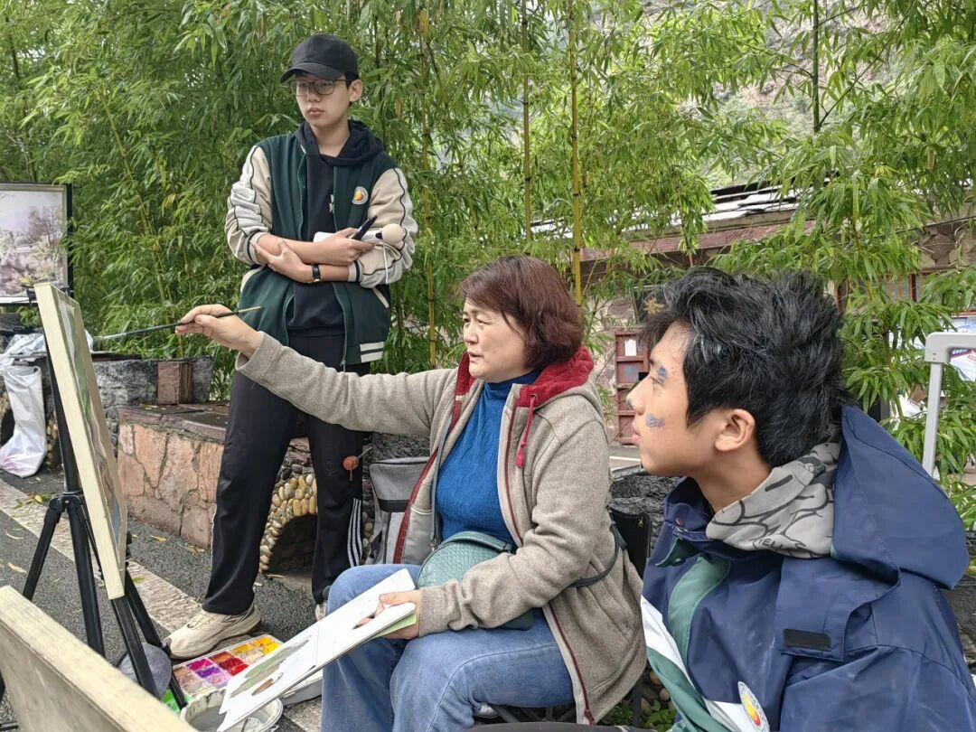 早餐用毕,学生们在班主任与美术教师的引领下,擎着鲜明的班旗,精神焕发、步履轻快地向各自的写生点进发。其间,美术教师们最为忙碌:待安顿好学生的位置,分派下小组的描绘任务,便穿梭在溪涧之畔、古树荫下、峭壁崖边,为学生们点拨适宜的景致。他们悉心引导着年轻的眼睛,于纷繁万象中凝练精粹,以细微处见宏大韵致——或以洗练的线条捕捉小景背后的深远意境;或在光影的交织变幻里,点染局部而铺陈整体,用斑斓的油彩晕染出山色的磅礴之美。每当学生执笔踌躇、面露疑难,美术老师便逐一身旁俯身,耐心指点,师生间以自由交流的笔触为语言,共同谱写着峡谷中最和谐生动的视觉乐章。