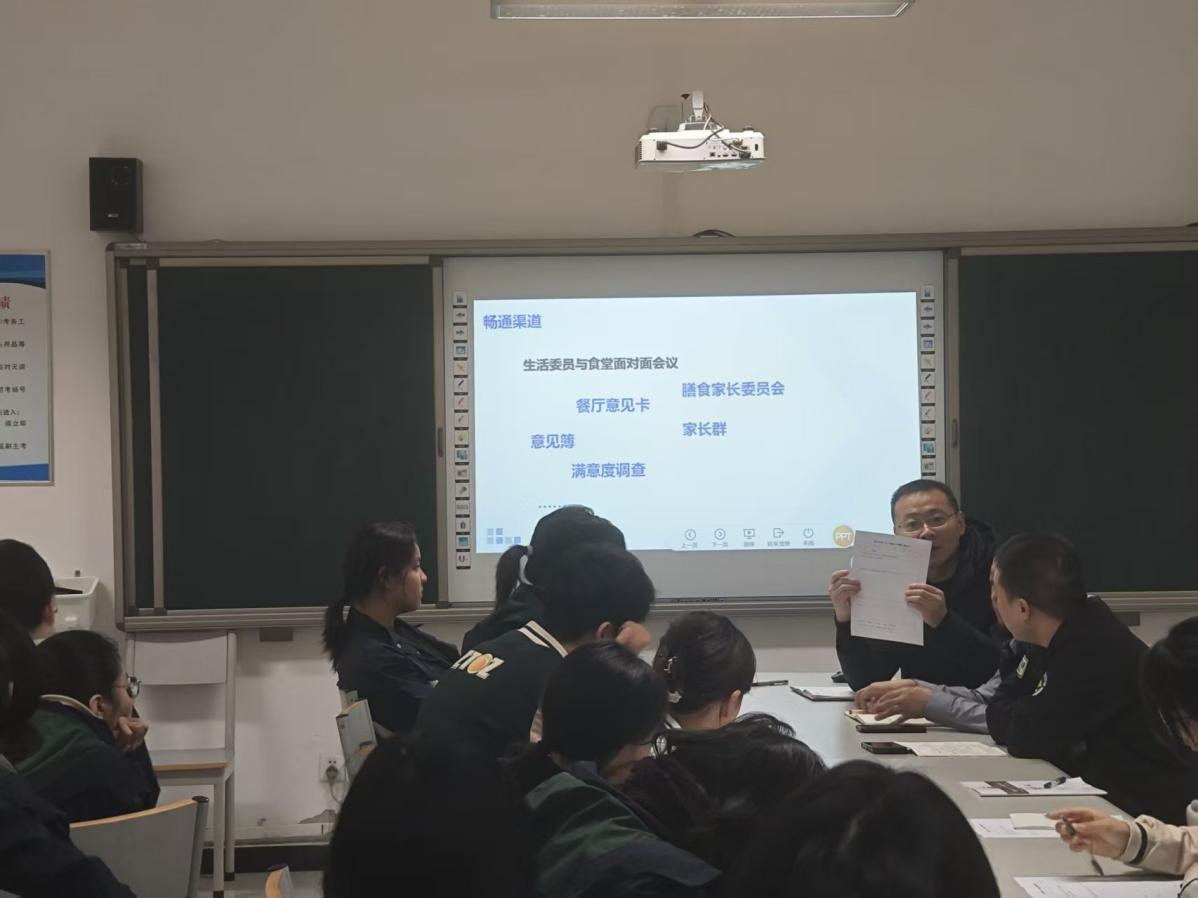会议最后,综治办赵主任进行总结发言。他对食堂经理积极回应学生诉求的态度表示肯定,同时强调,学生代表是连接学生与学校的重要纽带,其反馈的意见和建议为食堂服务改进提供了重要依据。学校将持续关注食堂服务质量的提升,建立健全学生意见反馈机制,每周收集学生对餐厅意见卡,每两周组织面对面交流活动,确保学生的合理诉求能够得到及时有效的解决。他希望食堂能够按照此次交流会上提出的整改方案认真落实,不断优化菜品结构和服务水平,为学生提供更加优质、健康、便捷的餐饮服务;也希望学生代表能够将会议内容传达给广大同学,同时继续收集同学们的意见和建议,共同推动食堂服务提质升级。