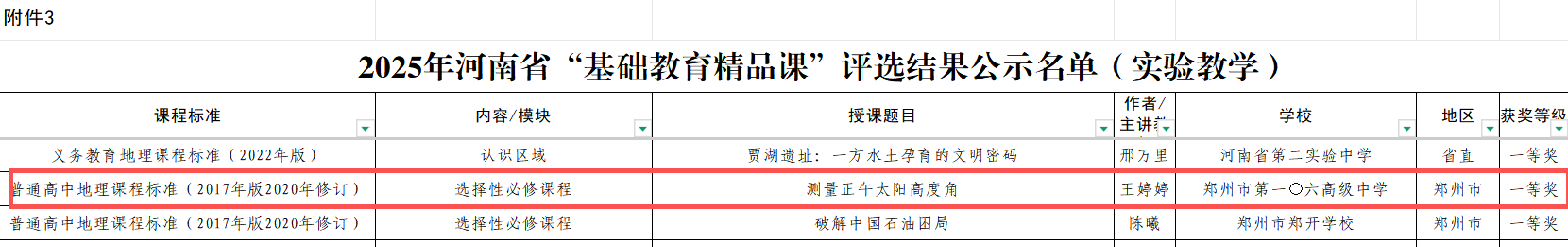 11月24日,河南省教育厅公示了2025年“基础教育精品课”省级评选结果,18luck官方客服端下载王婷婷老师凭借地理实验教学课《测量正午太阳高度角》脱颖而出,斩获省级一等奖。